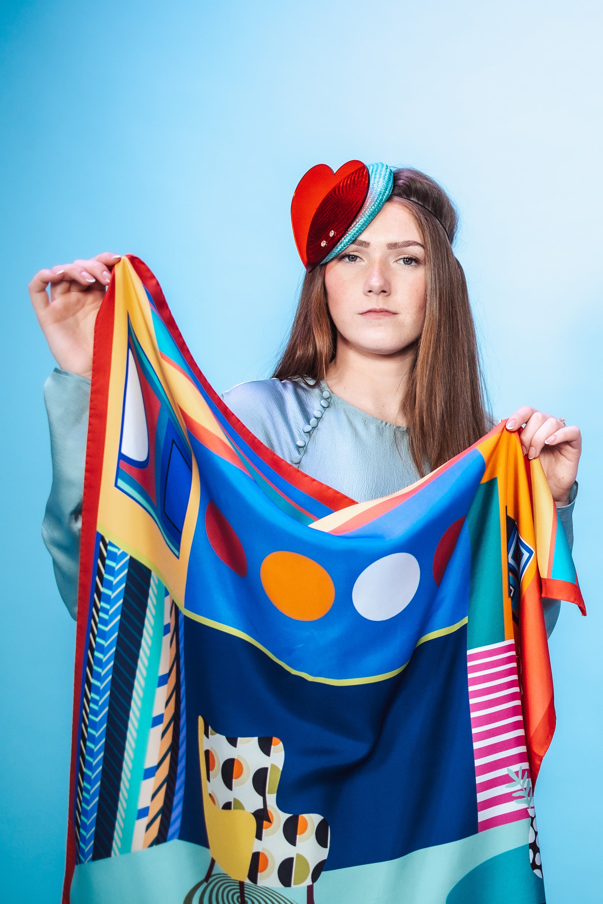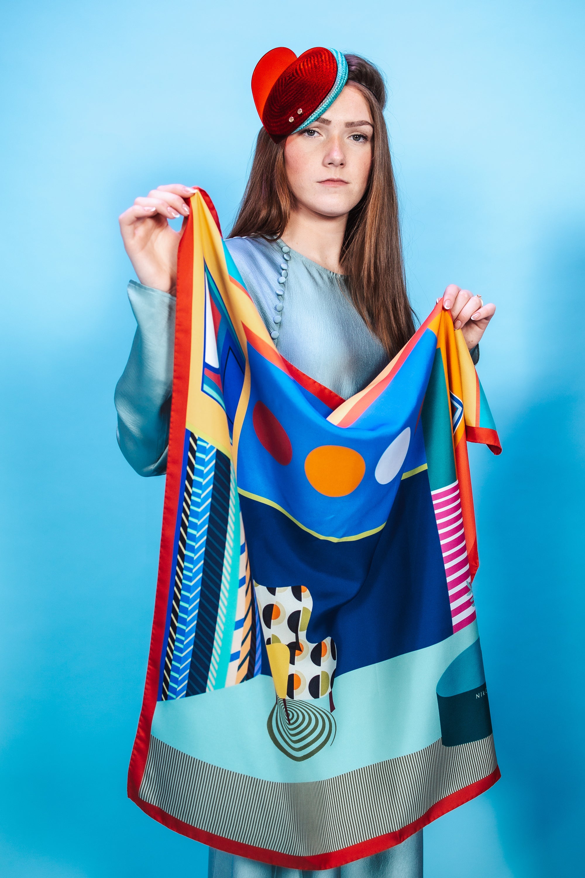 Wrap your silk scarf loosely around your neck and tie a soft knot, slightly to the side. With an all black or all cream ensemble, this simple styling draws attention upward and frames the face. Opt for scarves with bold prints – think florals, abstract brushstrokes or geometric designs your scarf to break or build symmetry